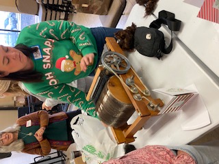 Now after all that food and fun, we got a little work done. Some of the members wanted instruction and advice on carding their wool. Quite a few of us brought our carders and fleece so we could exchange ideas on what works best. It was eye-opening. I have been carding wool for decades and still learned new techniques to try. It was fun to be gathered round the table trying out different hand holds and rolag making ideas. Beckie helped us with the hand carders and Kathie demonstrated the drum carder. Fun fun way to learn.
